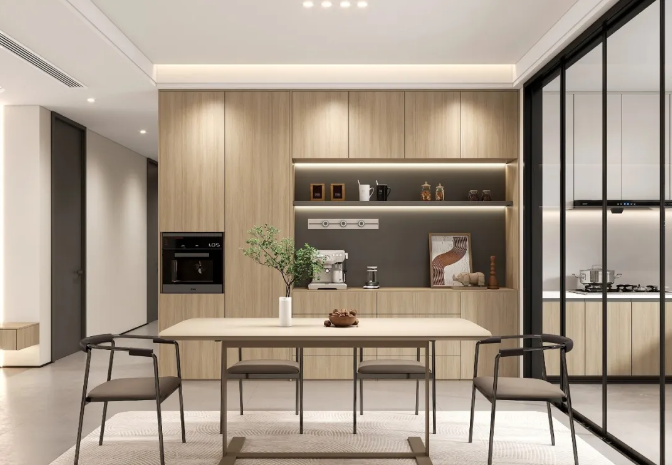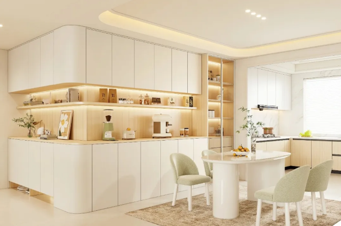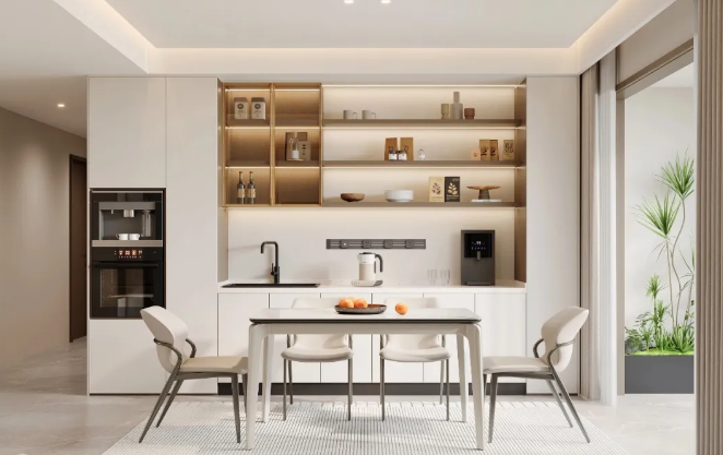 將咖啡機(jī)、水壺等小型電器外移至餐廳后,相應(yīng)的杯具也存放在餐邊柜內(nèi),既避免了油污、水漬,減少清潔頻率,在日常飲水、泡茶、喝咖啡時(shí)也不用再反復(fù)進(jìn)出廚房,縮短了生活動(dòng)線,提高居家舒適度。