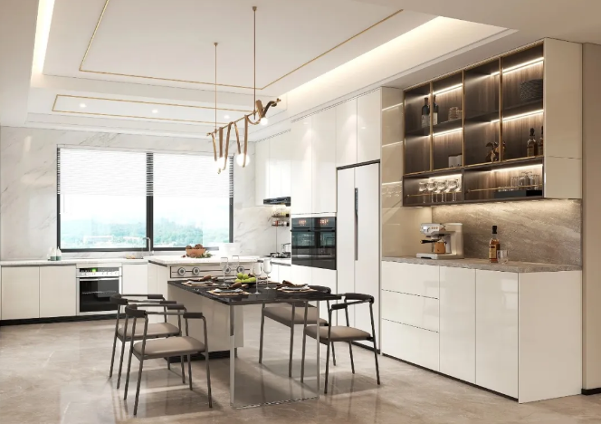 一般適用于開放式廚房,通常呈L型或U型布局,將餐邊柜作為櫥柜的擴(kuò)充,冰箱等大型電器也能輕松內(nèi)嵌,不占多余空間;柜體中部留空設(shè)置操作臺(tái),中西廚結(jié)合,多人操作也不擁擠。
